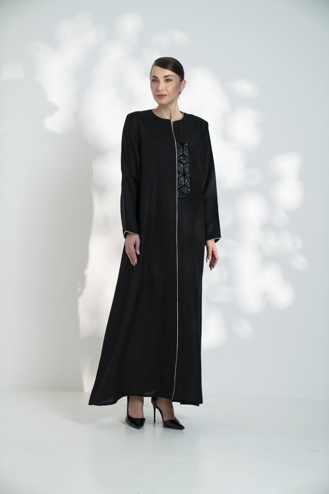 جلابية لنن بقيطان ومخمل مطرز ع الصدر اسود
