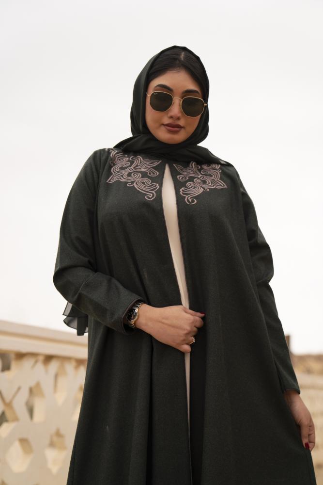 عباية جوخ ياقه والخلف تطريز زيتي