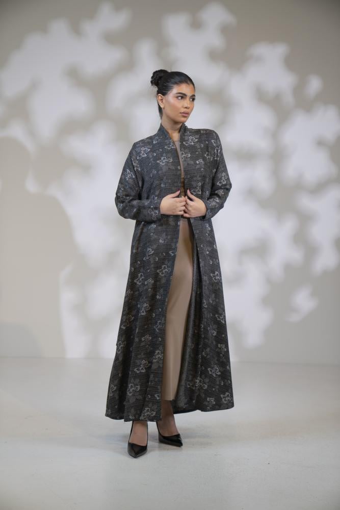 عباية فاخرة بتصميم دبل كلوش واسع من خامة تفته جاكار مشجر تضيف لمسة ملكية راقية.