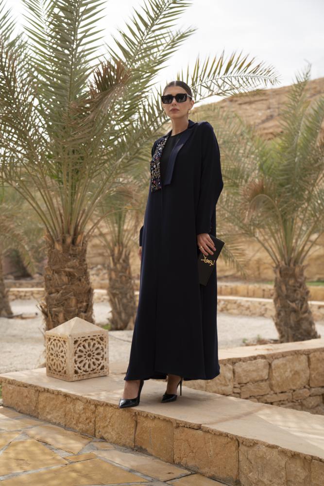 عبايه كريب بالطو ياقه مخمل مطرز كحلي