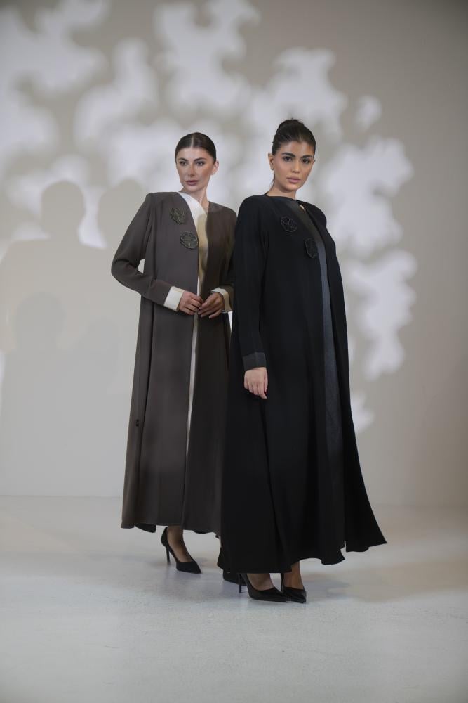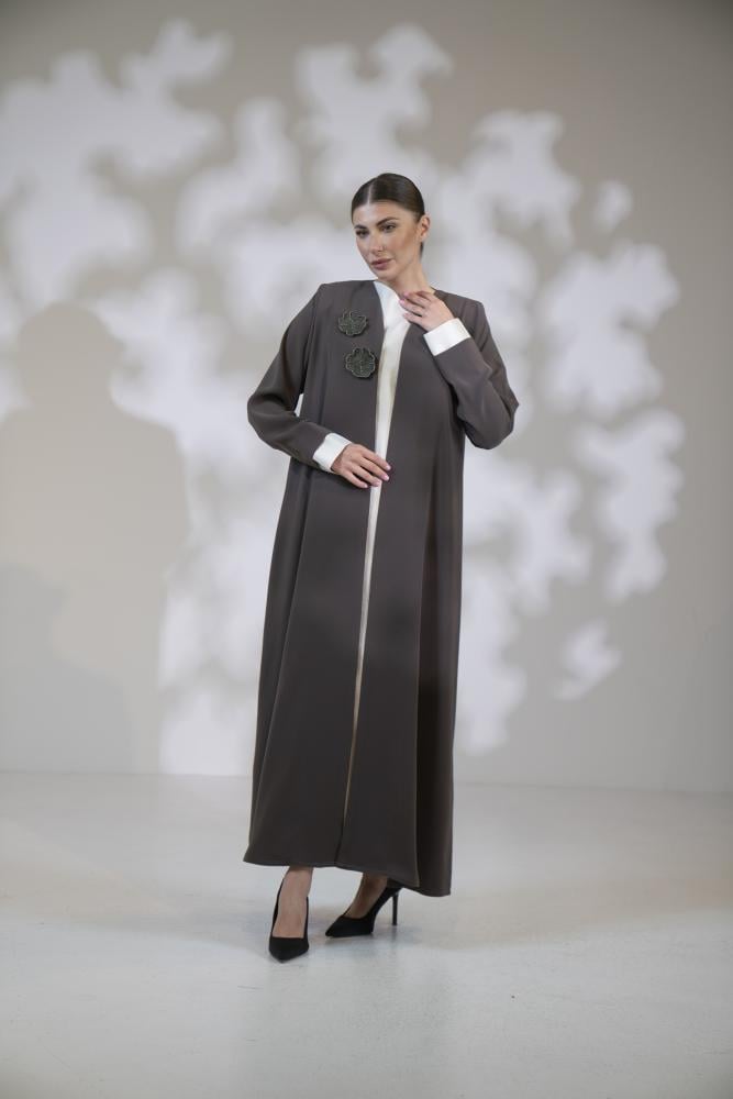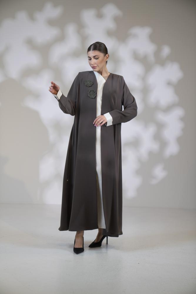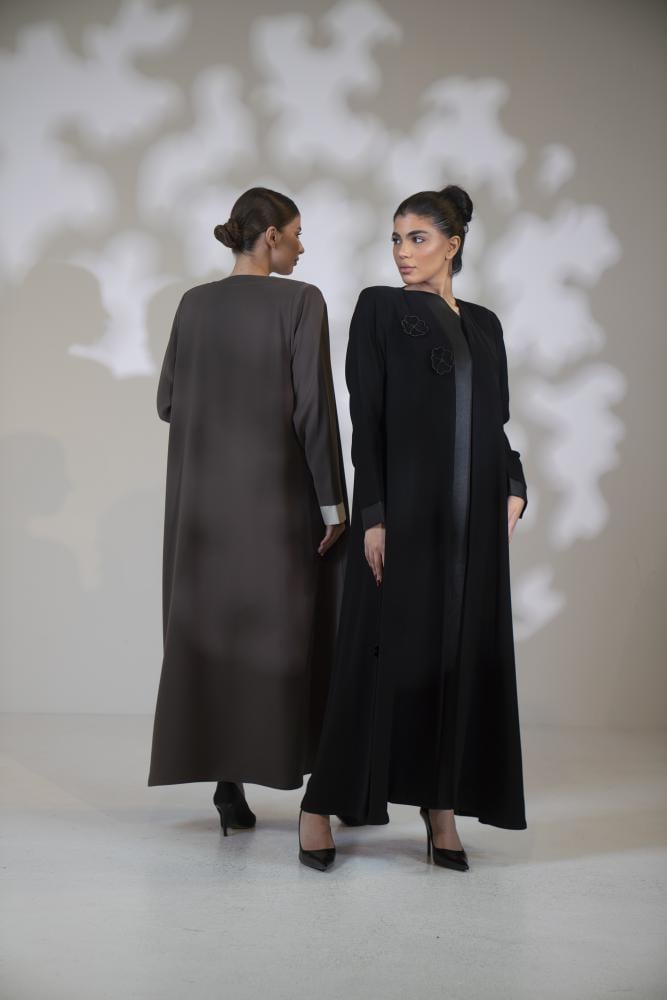 Two-piece crepe abaya with jacquard taffeta details and a cuff on the chest